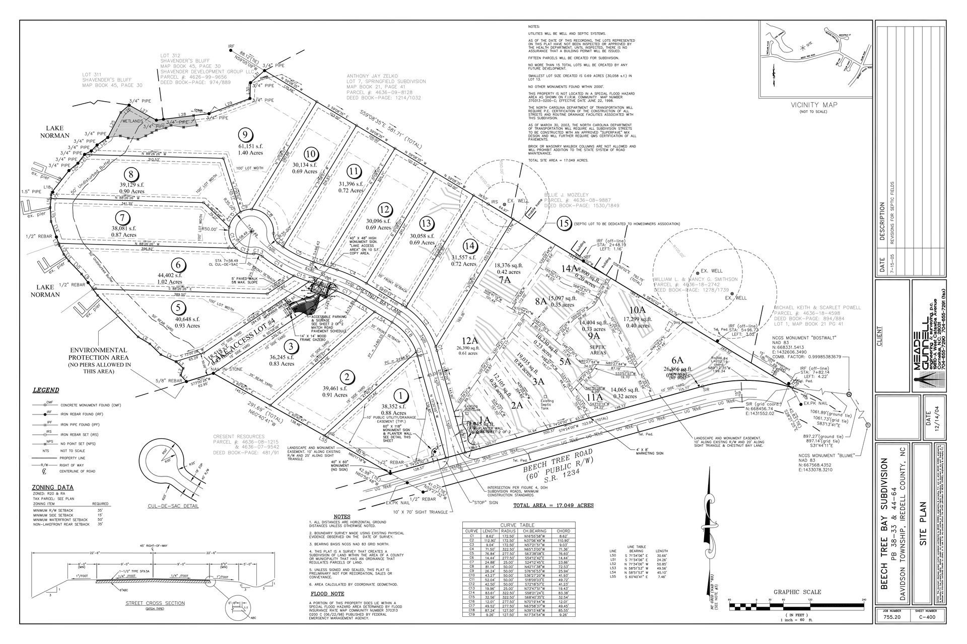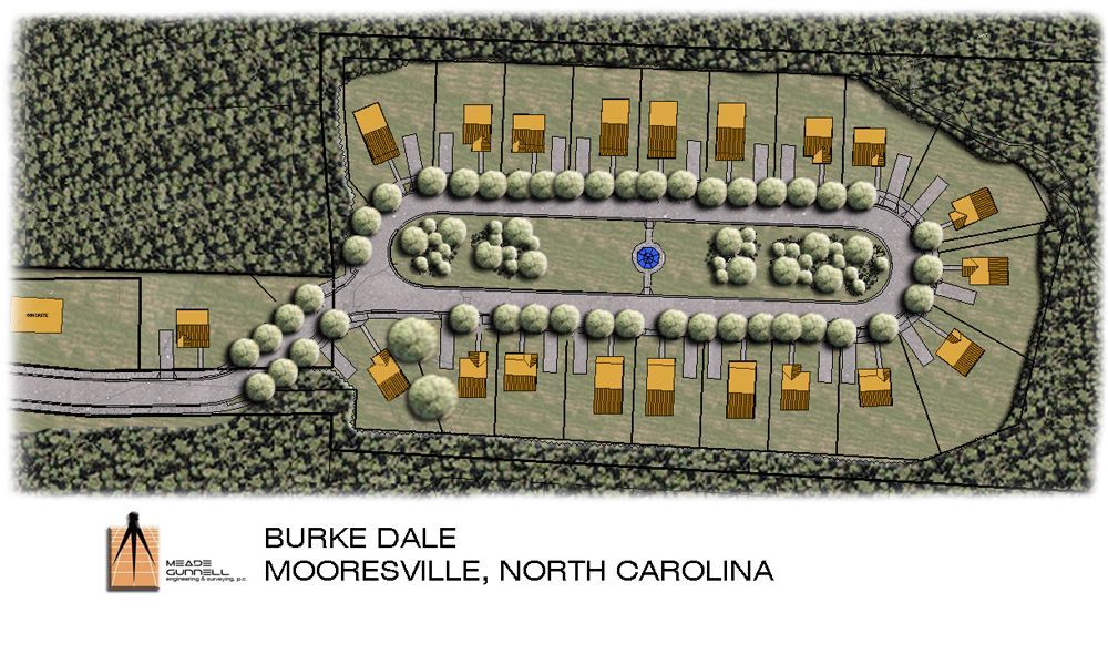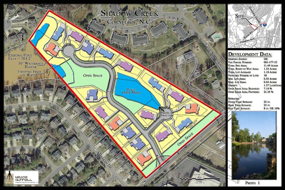 Shadow Creek is an 18 lot single family subdivision located in Cornelius, North Carolina. The design of this project had many design and regulatory challenges. The existing pond was breeched by the previous owner and required permits from the North Carolina Division of Water Quality and the Corps of Engineers to rehabilitate the dam and fill the pond. The developer wanted to save as many trees as possible and work with the existing topography to minimize the impacts to the wooded site. In order to do this, the roads had to be designed as private streets to utilize more relaxed design standards. The Charlotte-Mecklenburg Utility Department accepted the sanitary sewer as a public system (in a private street), but would not accept the water system since the streets were private. The water system had to be designed and submitted to the North Carolina Department of Environment & Natural Resources for approval as a private system. There were also design challenges due to the watershed buffers associated with the project’s proximity to Lake Norman. The result of the design and engineering efforts of MEADE-CIVIL Engineering, PLLC engineering & surveying is one of the most beautiful subdivisions in the area with stands of mature trees and natural open spaces.