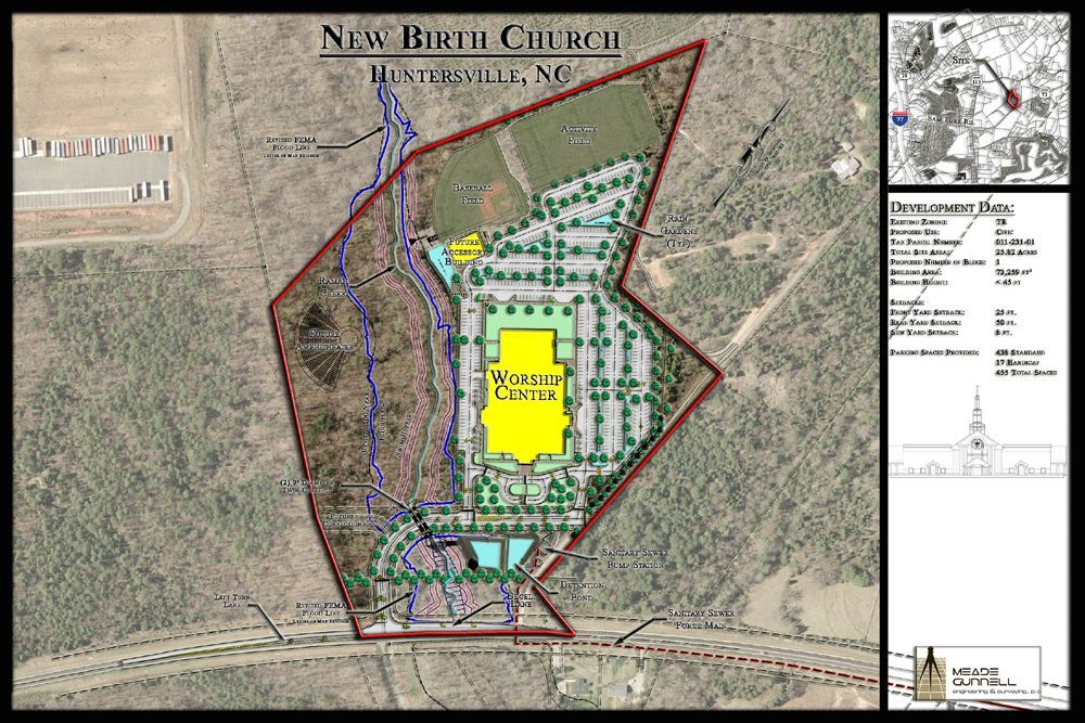 The New Birth of Charlotte Church is an 80,941 square foot church located on a 25.8-acre site originally addressed as 11901 Sam Furr Road in Huntersville North Carolina. Part of the development of the site is the construction and platting of approximately 800 linear feet of new street named New Birth Drive. The Church is now addressed as 17001 New Birth Drive, Huntersville, North Carolina.