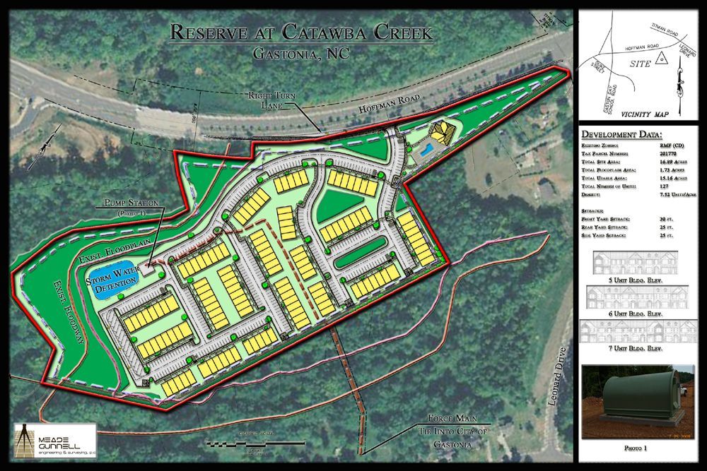 The Reserve at Catawba Creek is composed of 127 town-home units and is located off of Hoffman Road in Gastonia, N.C. MEADE-CIVIL Engineering, PLLC provided Master Planning, Flood Study, and Civil Engineering for this project. Community features a swimming pool, large open spaces, children play areas, and great walking terrain. Accessible units are available and placed throughout plan for façade variety.