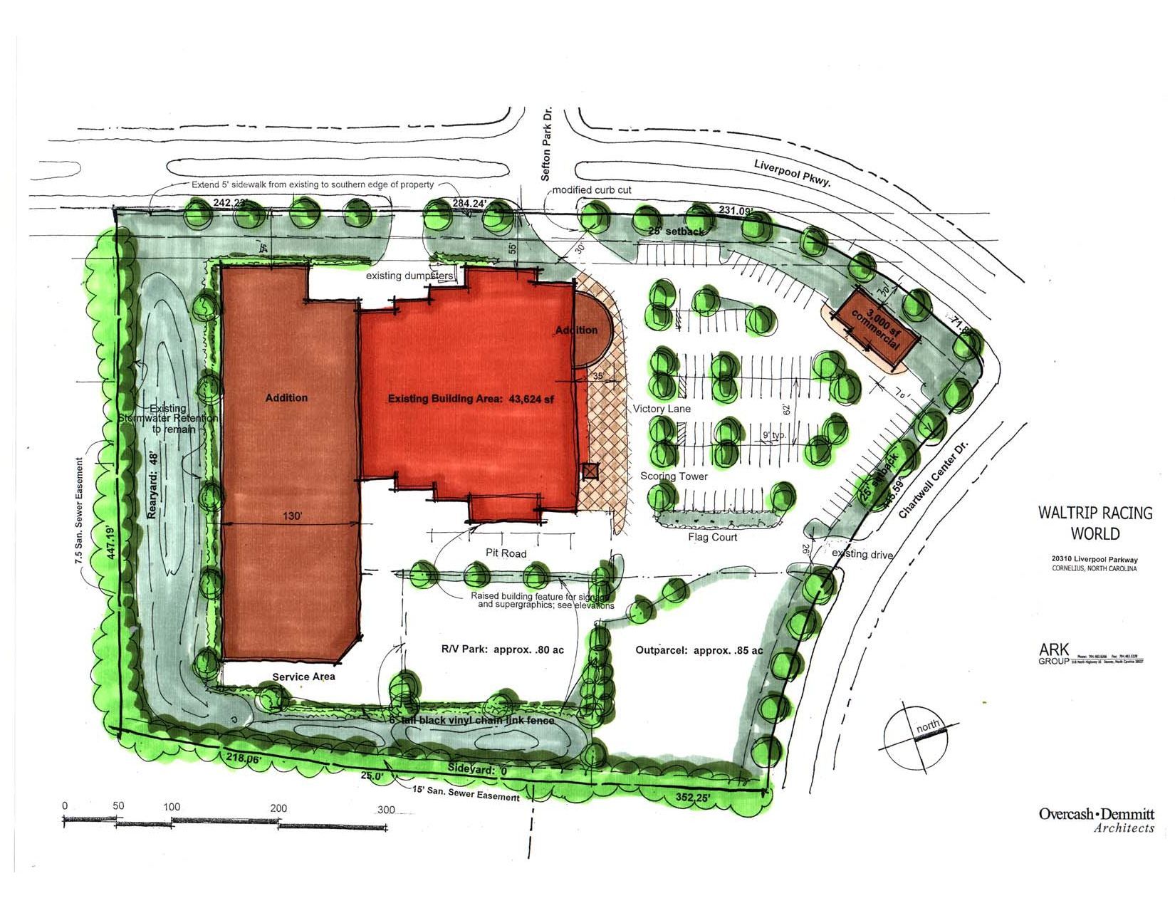 The church is an 80,941 square foot facility includes a sanctuary of 2,338 seats, an 11,933 square foot multi-purpose area, offices, conference rooms, a kitchen, recreation spaces, as well as a café/bookstore. The site has the parking lot capacity of 455 vehicles with a softball and soccer field amenity. The sanitary sewer service is provided with a pump station and approximately 2,000 linear feet of force main. There will be approximately 1,300 feet of improvements to Sam Furr Road (NC 73) in accordance with the NCDOT.